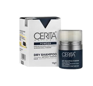 - شامپو خشک پودری سریتا حاوی ترکیبات گیاهی مفید و مغذی برای کف سر